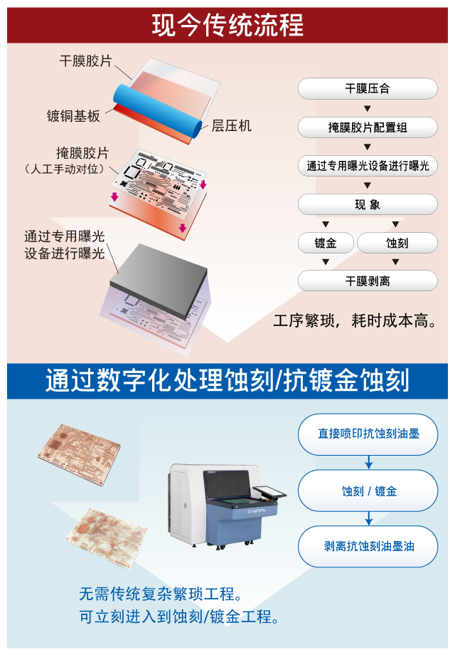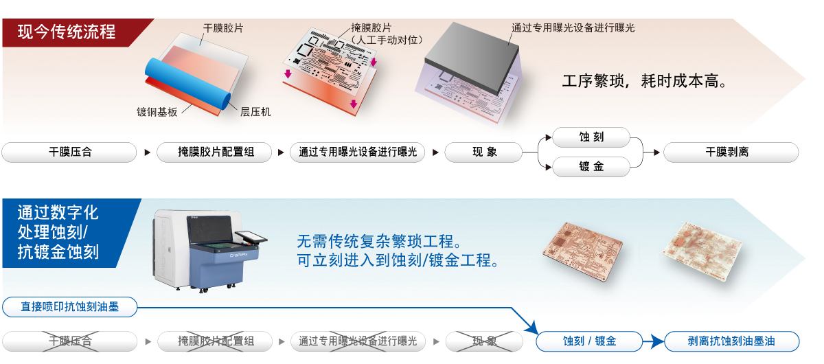淘汰传统工艺所需的双层掩膜胶片、层压设备、专用曝光机及显影工序,
