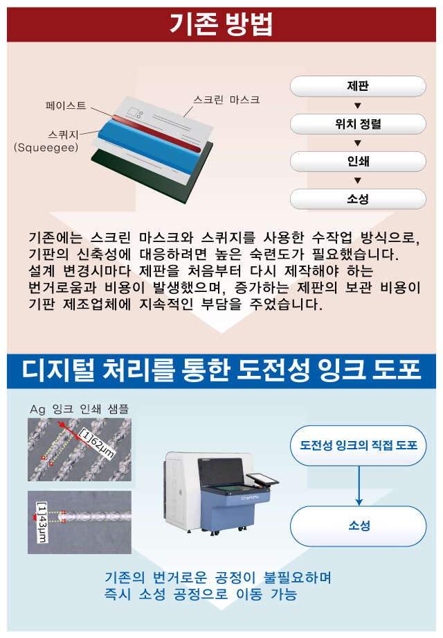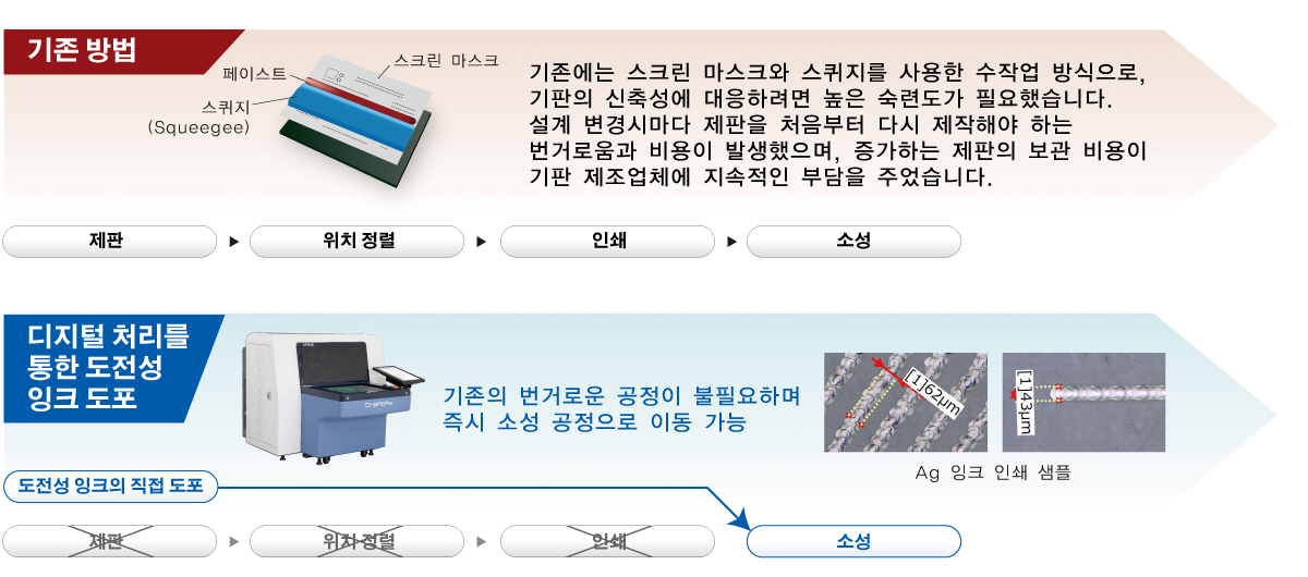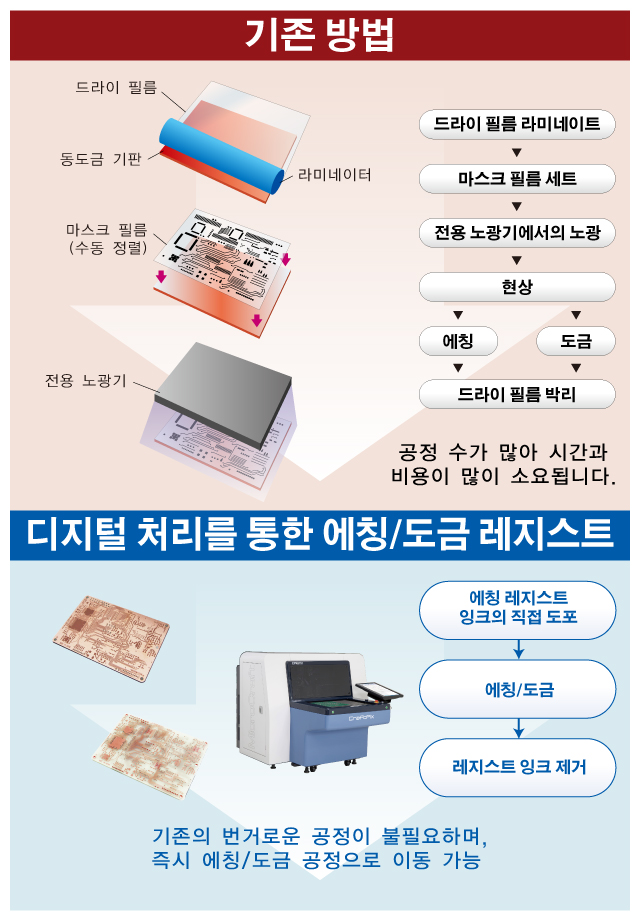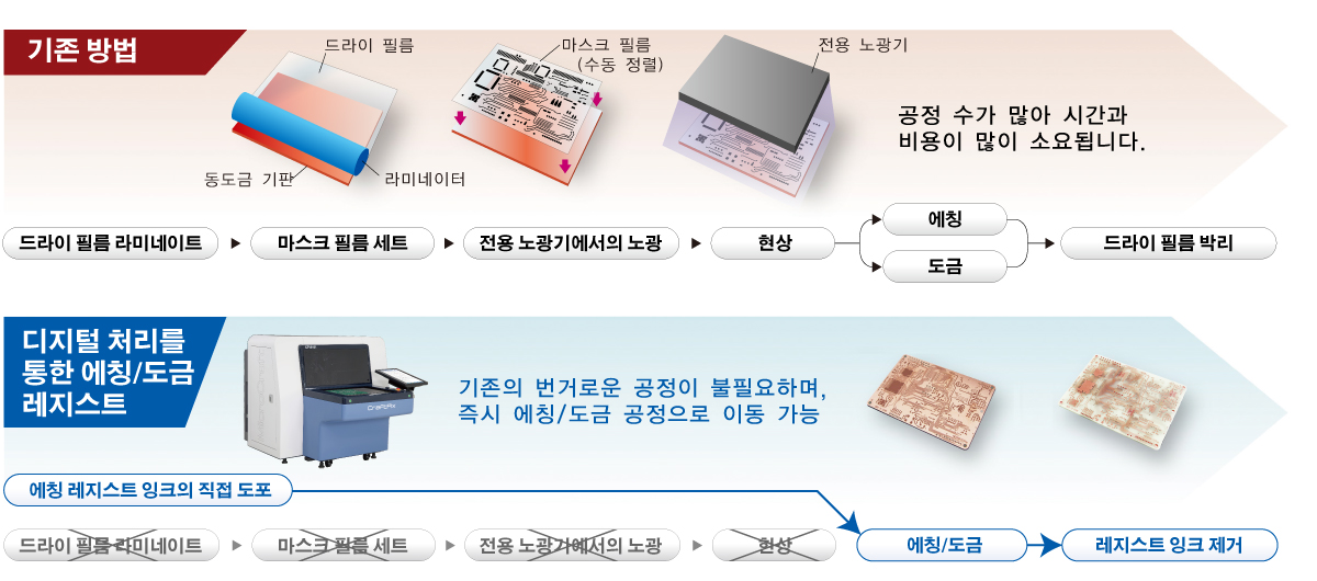 기존 방식에서 필요했던 두 종류의 필름, 라미네이터, 전용 노광기,